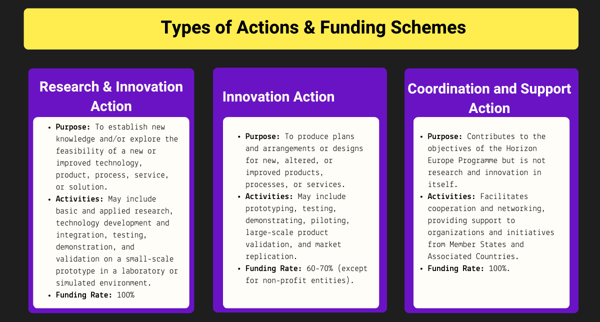 Horizon Europe categorizes funding into three main types. Choosing the correct action is vital, as each has distinct requirements for technology maturity (TRL), participant types, and funding rates.