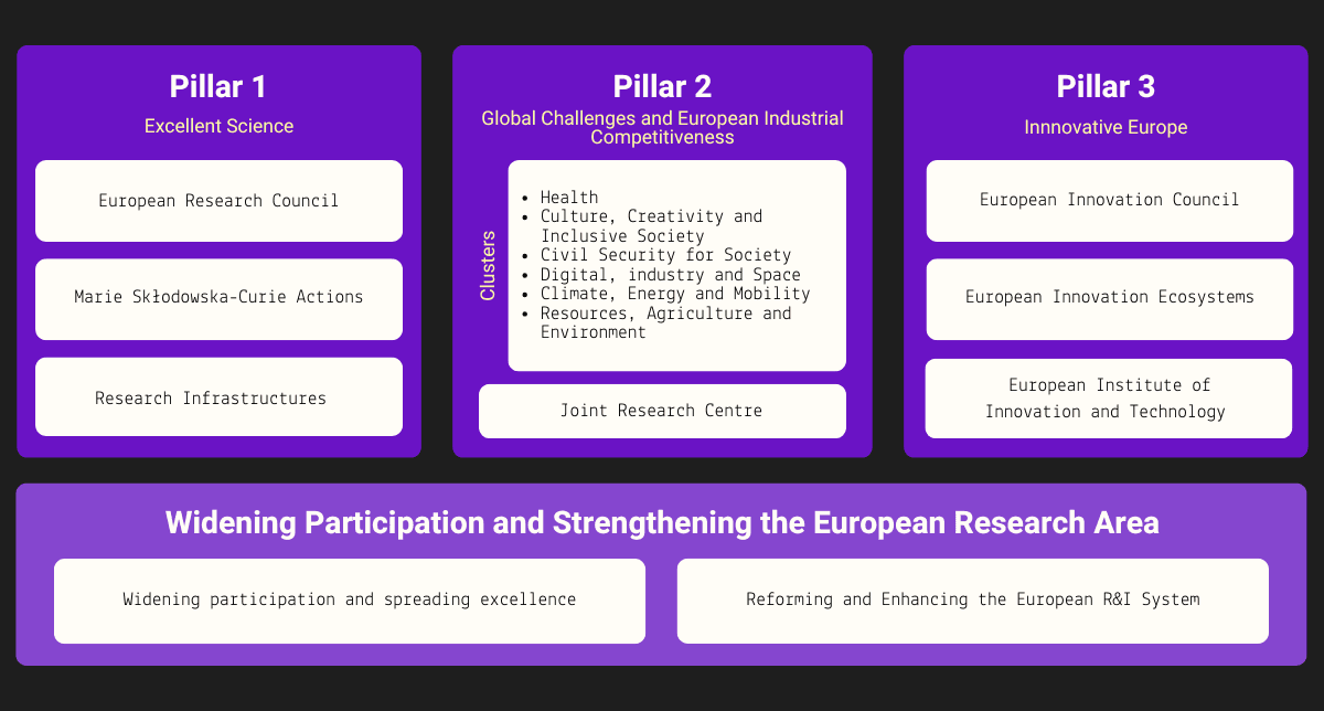 Horizon Europe is built around three interconnected pillars, complemented by a cross-cutting programme, together supporting the full research and innovation journey — from scientific discovery to market deployment and scale-up.